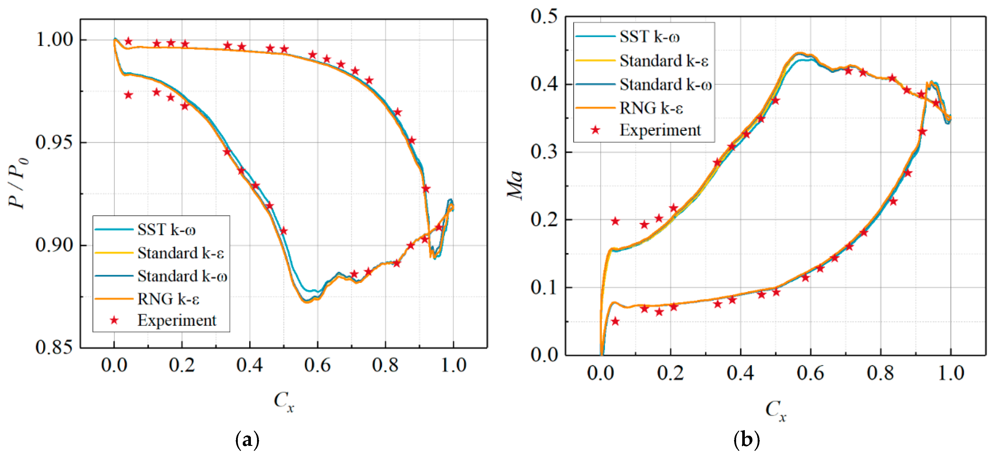 3.2. Turbulence Model Validation for Heat Transfer and Aerodynamic Performance