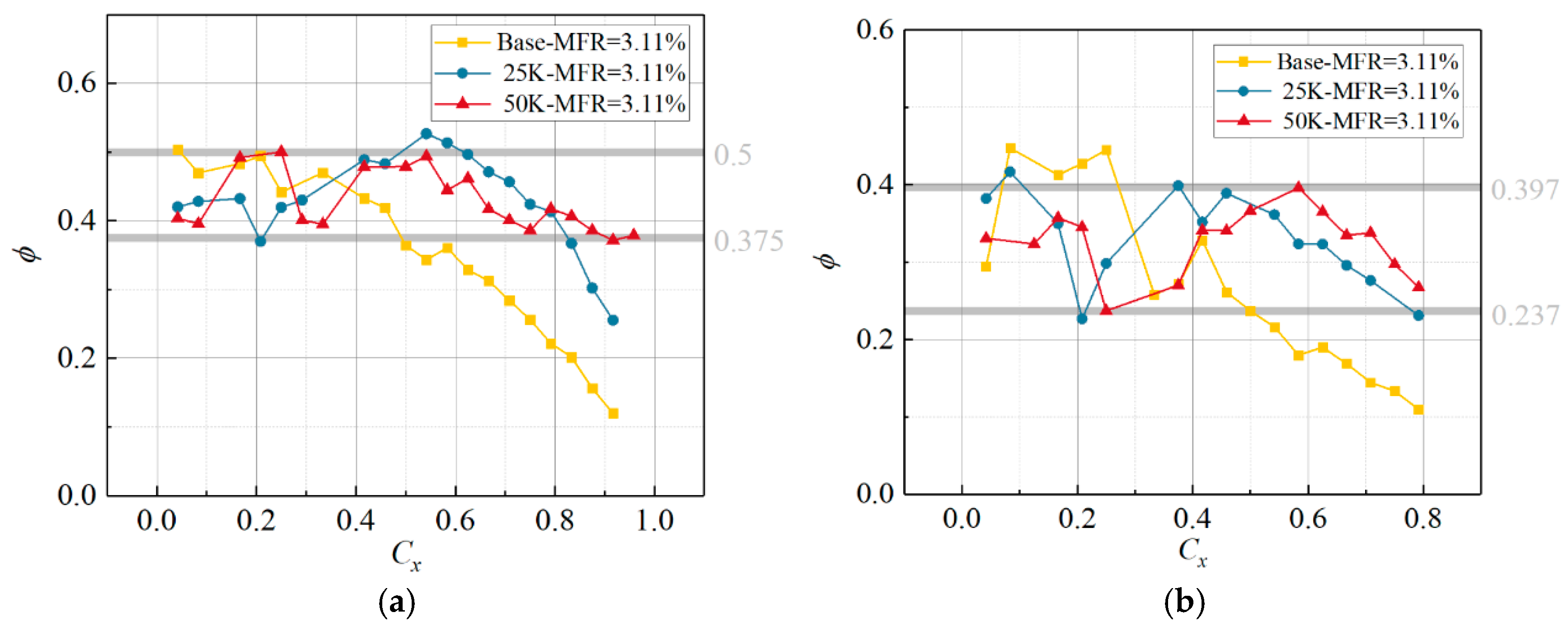 4.2. Exploring Variations in Cooling Effectiveness with Various Film Hole Configurations