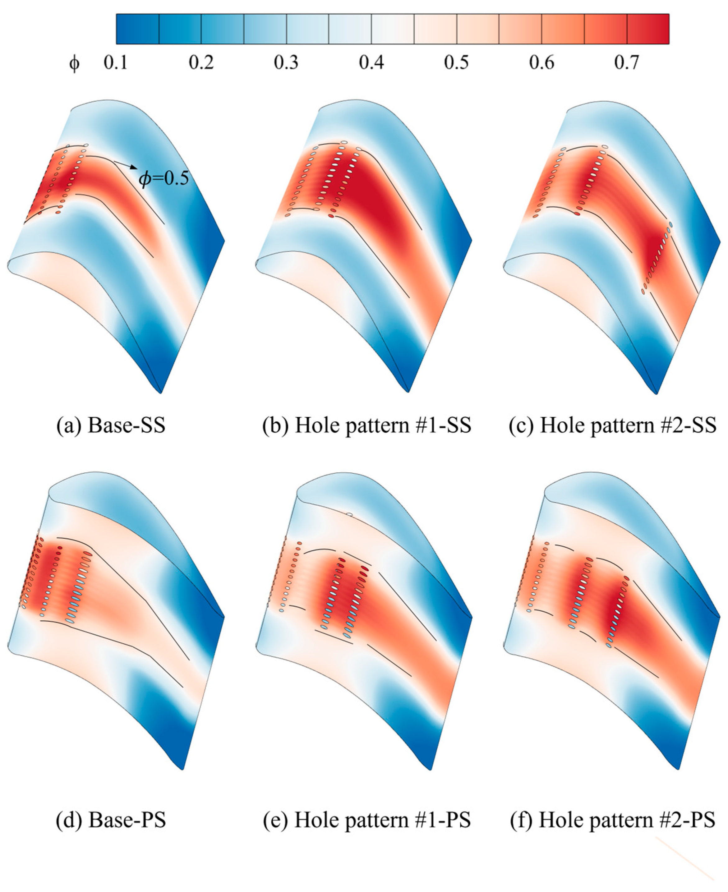 - At a relatively low mass-flow rate, the “showerhead cooling” of Base greatly enhanced the cooling effectiveness along the leading edge on the suction side, but it also markedly reduced the trailing-edge cooling. The film holes in Hole pattern #1 and Hole pattern #2 were distributed more uniformly over the blade. This layout offset the limited streamwise coverage of a single-row film. The suction side showed a rising trailing-edge cooling effectiveness for Hole pattern #2, 83.04% higher than Base and 29.18% higher than Hole pattern #1. On the pressure side, the enhancements were 17.71% and 55.03%, respectively.