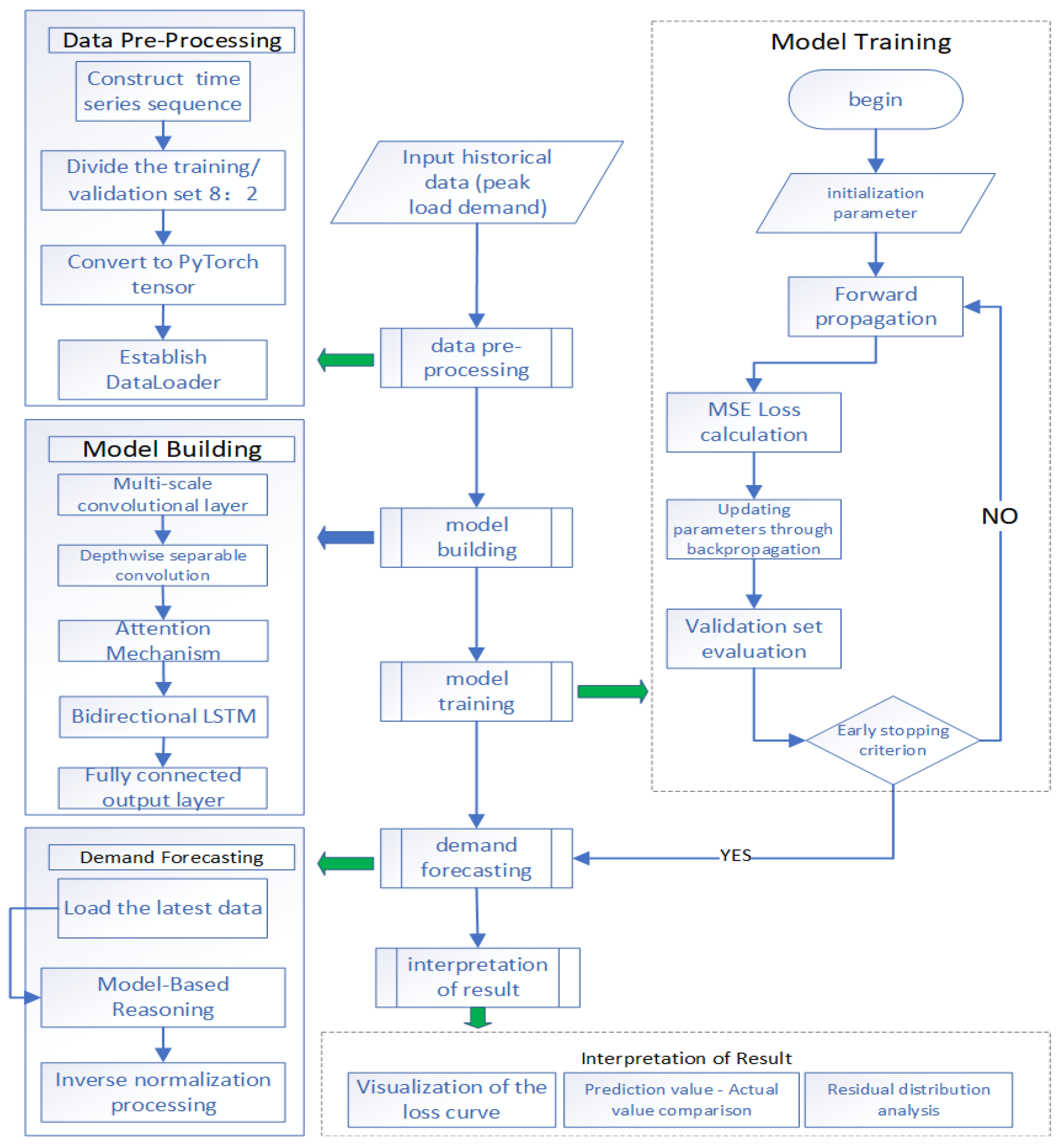 (1) An improved CNN-LSTM time series prediction model is proposed in response to the uncertainty of the next day’s peak demand. Multi-scale feature fusion and attention mechanisms are incorporated during the model construction process to integrate information at different levels and dynamically focus on key features, jointly enhancing the model’s ability to capture data.