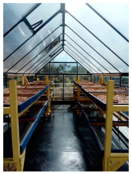 Greenhouse-type dryers use transparent or translucent covers (plastics, polycarbonates, glass, etc.), which enable the use of thermal radiation, in addition to protecting the products from the exterior elements [12]. It is known that open-air drying (solar or in the shade) has several drawbacks. These include rehydration at night or on rainy days, contamination by dust, insects, or fungi, low quality, and color changes, in addition to the formation of toxic substances due to the reabsorption of moisture from the material [13,14].