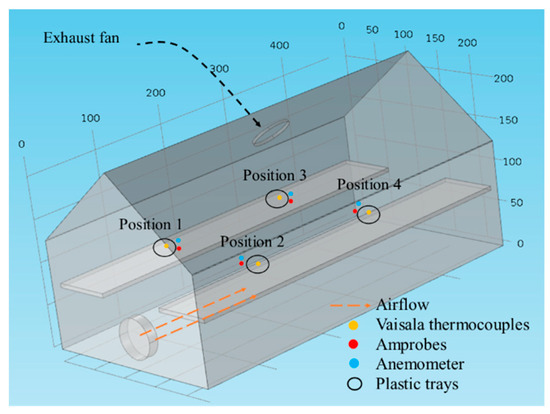 A 3D computational simulation was implemented, considering a radiation model with a participating medium. This model considers mainly the absorption index and scattering of the humid air present in the drying chamber. It also considered the refractive index of the air, the temperature of the pods (considering the thin layer) placed on the trays, the transfer coefficients, and the temperature of the concrete floor. The mathematical model is represented by Equations (16) and (17). The participating media (domain) is affected by the boundary conditions; it means a heat flux is applied in the boundaries of air volume by considering the transmissivity of polycarbonate. We experimentally measured the irradiance that the polycarbonate walls receive. The greenhouse floor imposes temperature conditions at the time of measurement. At different simulation times, the irradiance was identified. The simulation was solved in a steady state, with 114,892 degrees of freedom, plus 19,699 internal elements. A steady-state simulation can be implemented by assuming that average temperature and air flow conditions do not change drastically from one minute to the next; in other words, we are talking about average conditions at a given moment, and then simulations are a representative condition of the system that is validated with experimental information. Likewise, steady-state 3D simulation has proven to be a powerful and efficient tool for evaluating spatial temperature in greenhouse-type systems [20]. For the numerical solution, we used the PARDISO solver, with a relative tolerance of 0.001 and an absolute tolerance of 0.1. The simulation solves the air temperature variable, which was compared to the experimental measurement points.