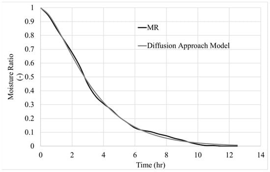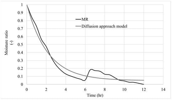 In the case of forced convection, it is important to note that the convection airflow passing through the trays is low, with an average air velocity of 0.5668 m/s (SD = 0.1121). In this experiment, a process of moisture reabsorption was observed after 6 h. This moisture absorption process is explained by the fact that the pods remain in the dryer overnight. This type of problem is recurrent in solar drying systems, especially in greenhouse-type dryers, since this type of process lasts 2–5 days, depending on weather conditions, and during the night, the food remains in the drying chamber. The proposed model (Figure 4) provides a comprehensive description of the drying kinetics. The reabsorption process is not reproduced, as it is an unusual event caused by the nature of the experiment. The parameters estimated for this model were as follows: a = 0.952273, k = 0.462585, and b = 0.