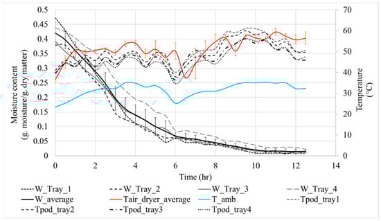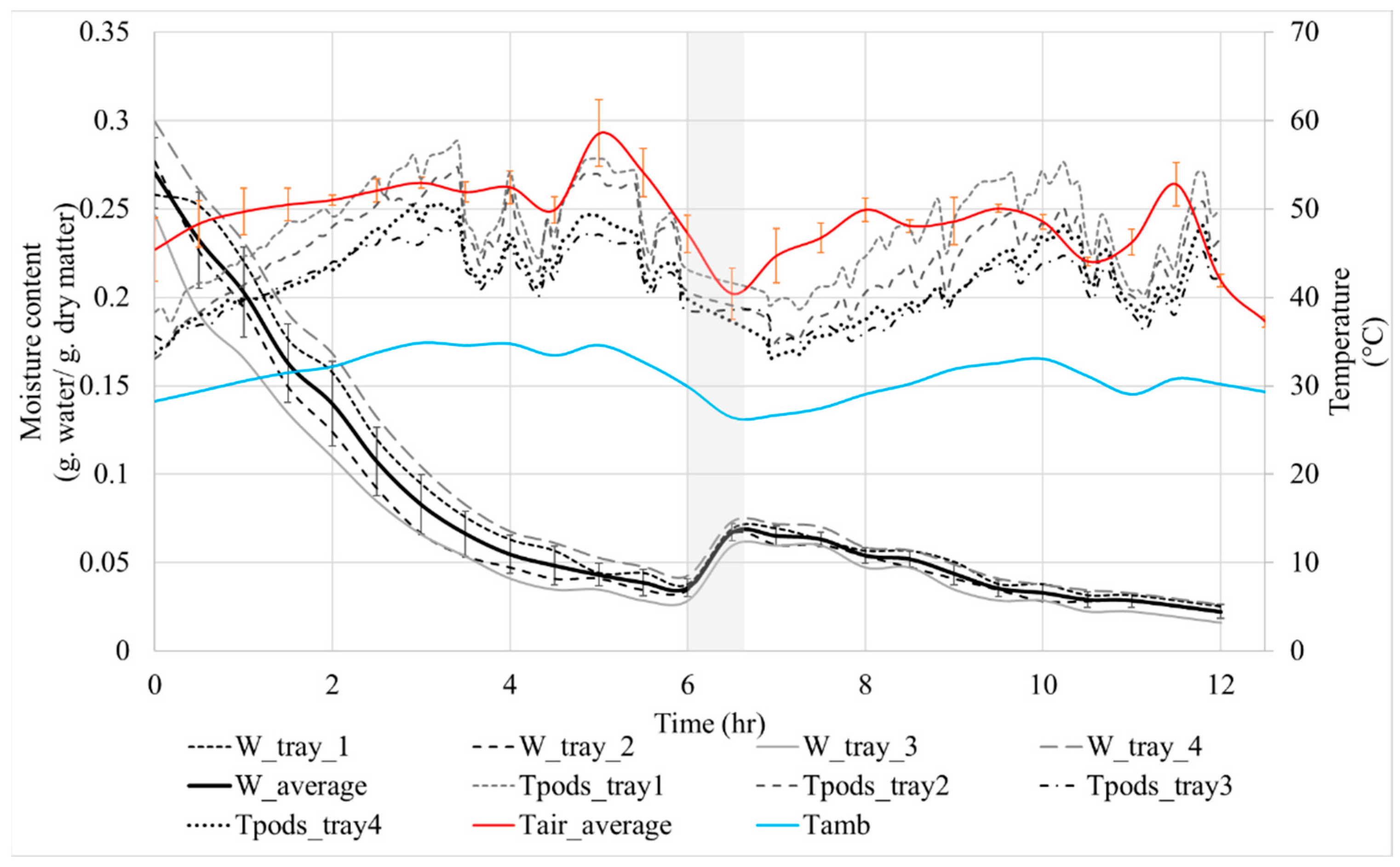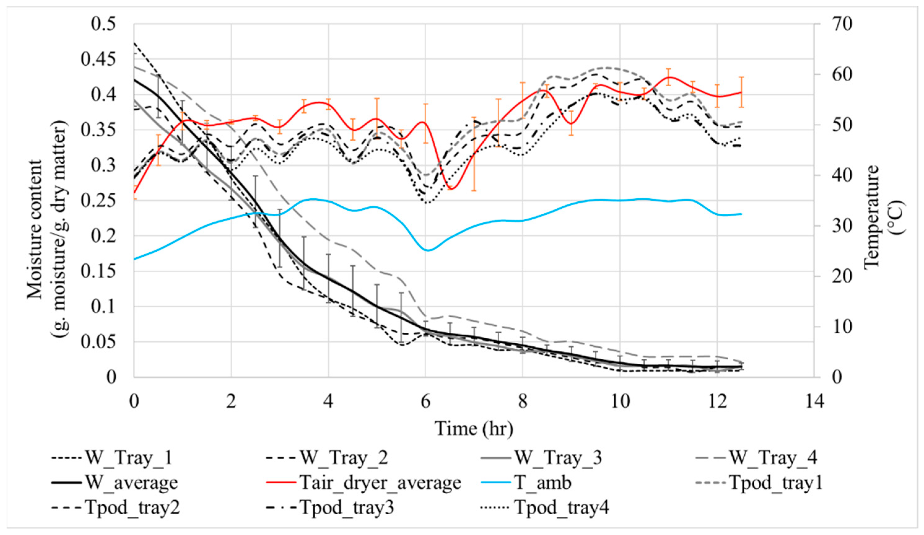 A total of 19.3 kg of pods was cleaned, washed, and distributed in the trays inside the dryer. Pod temperature and weight were also recorded. AMPROBE sensors record information every 10 min and VAISALA sensors every minute. VAISALA sensors were inserted in the pods. The weight of the samples was recorded every half hour. For each experiment, the drying lasted two days. The data recorded from day 1 corresponds to the monitoring from 10 to 16 h, and the data from day 2 corresponds to the same period. To obtain full kinetics, the data from day 1 and day 2 were merged. The average moisture content of the pods was 0.4302 g moisture/g dry matter.