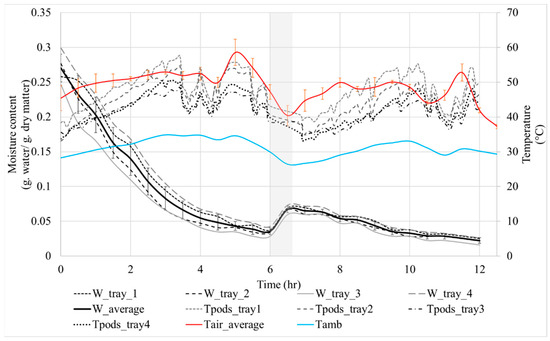 Data for the experiment with forced convection is presented in Figure 6. The initial weight of the pods was 18.67 kg. An average airflow of 0.5668 m/s (SD = 0.1121) was supplied over the trays. Figure 6 shows the drying kinetics and temperatures for this experiment. The experiment was also carried out in two days, and the procedure was similar to the experiment in natural convection; nevertheless, in this experiment, a larger perturbation in solar radiation was observed. During the night, the reabsorption of humidity was experimented with due to a significant increase in RH during the night (observe the curve at t = 6:30 h). During this experiment, a more intense adsorption (gray area) was observed due to a significant increase in relative humidity during the night, which is corroborated by the experimental data. There are slight differences between the drying kinetics, most likely due to differences in the distribution of airflow inside the greenhouse. It is well known that inside greenhouses, irregular airflow patterns are formed (stratification of air), for which different authors have addressed the issue [20,28,29]. This issue presents a recurring challenge in dryers, as achieving airflow homogenization is difficult due to several factors, including the geometry and size of the greenhouse, the type and power of the fan, the position of the fan exhaust, the orientation of the greenhouse, the outside air inlets, and the initial pressure. Despite these observations, the greenhouse dryer does provide air conditions to dehydrate the pods. The final moisture content of the samples was below 0.05 g·moisture/g·dry matter, which is convenient for their subsequent grinding.