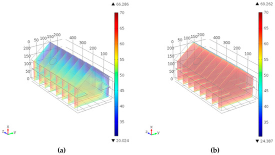 (a) Simulation for natural convection at t = 4 h and solar irradiance = 860 W/m2. (b) Simulation for forced convection at t = 5 h and solar irradiance = 980 W/m2.