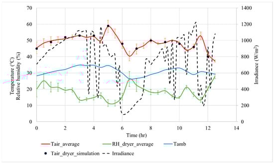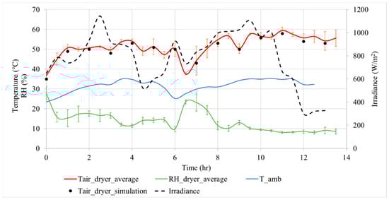 For the experiment with natural convection, Figure 8 shows the average air temperature (red line) and the simulated results (black dots). Numerical results correspond to stationary solutions. The maximum air temperature in the dryer was T ≈ 60 and was recorded at t ≈ 11 h, when the value of solar irradiance was I ≈ 1000 W/m2. This information is very useful since it allows us to identify the fluctuations of the drying conditions, which confirm their high dependence on the weather. In this figure, the solar radiation data for the first day corresponds to the time interval of 0–6 h, while the data for the second day corresponds to 6–12 h. The blue line shows the ambient temperature (outdoor air temperature), which ranges between 25 and 35 °C. Relative humidity is affected by temperature; the green and blue lines correctly describe this dependence. The calculated value of RMSE for simulated air temperature is 1.2593 °C.