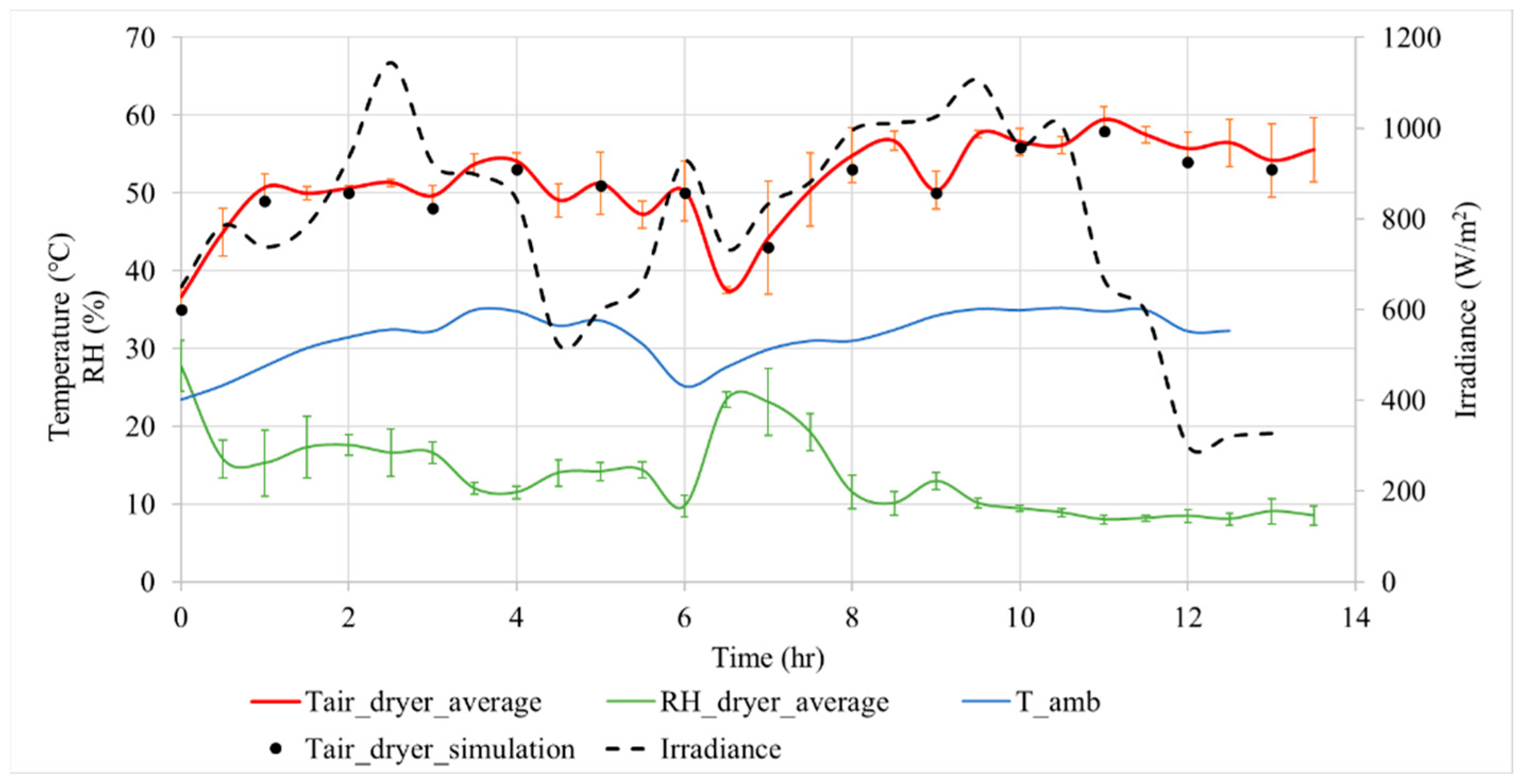 Figure 8 shows the average air temperature (red line) and the simulated results (black dots). Numerical results correspond to stationary solutions. The maximum air temperature in the dryer was T ≈ 60 and was recorded at t ≈ 11 h, when the value of solar irradiance was I ≈ 1000 W/m