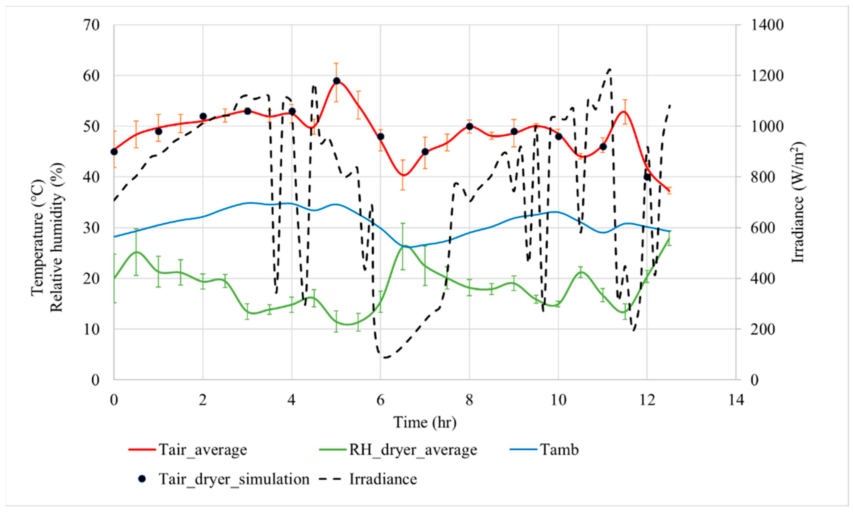 The simulations represent the 3D temperature distribution in the volume of the drying chamber. It is important to note that the air flow over the trays for the forced convection experiment slightly increases the transfer coefficients. Solar irradiation patterns were different for the experiments. To compare the two drying scenarios more objectively, it is important to analyze the experimental irradiance data, the ambient temperature, the relative humidity in the drying chamber, the evolution of the average drying air temperature, and the simulated air temperature values. This is shown in