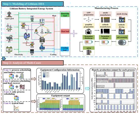 To address this challenge, understanding the energy characteristics of lithium battery manufacturing is crucial. The lithium battery industry represents a typical process manufacturing industry characterized by sequential, tightly coupled unit operations. While different battery chemistries (e.g., LFP, NCM, NCA) exhibit distinct material properties, their manufacturing follows broadly similar process flows [7,8]. The energy consumed by lithium battery production primarily includes electricity and heat [9] along with cooling requirements and a certain amount of nitrogen used as a protective gas for the production line [10], making the energy supply system a typical IIES [11]. The high reliance on energy presents a substantial challenge for carbon reduction, especially when the energy supply is heavily dependent on fossil fuels [12,13]. In order to decarbonize the lithium battery industry, it is necessary to optimize energy supply systems, control the manufacturing process, and make full use of the energy storage features of the process. Hence, this paper proposes a low-carbon economic planning method for the lithium battery IIES, aiming to not only reduce the planning costs for industrial users but also to improve energy utilization efficiency whilst reducing societal carbon emissions.