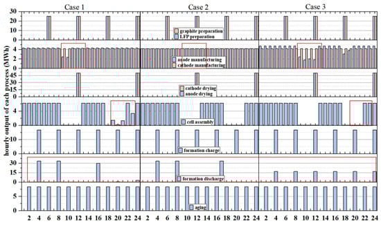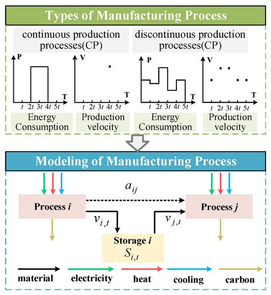 Based on the production cycle, processes are categorized into continuous production processes (CP) and discontinuous production processes (DP). Continuous production processes have production cycles less than or equal to the minimum scheduling period (1 h), with outputs produced every hour. Discontinuous production processes have production cycles longer than the minimum scheduling period, producing outputs only after the completion of the production cycle with constant loads throughout. In this research, the production of anodes, cathodes, and cell assembly in lithium battery manufacturing are classified as CP processes, while the remaining processes are classified as DP processes. Lithium battery production is divided into two parts: production and intermediate product storage. The schematic diagram of modeling is depicted in Figure 2.