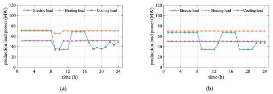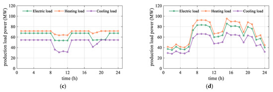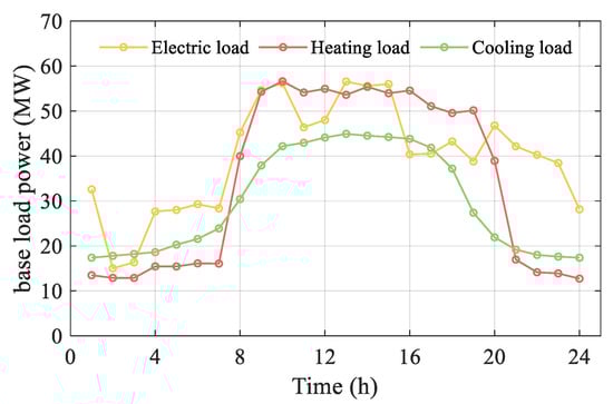 where , and represent the basic electrical, heating, and cooling loads (MW), respectively.