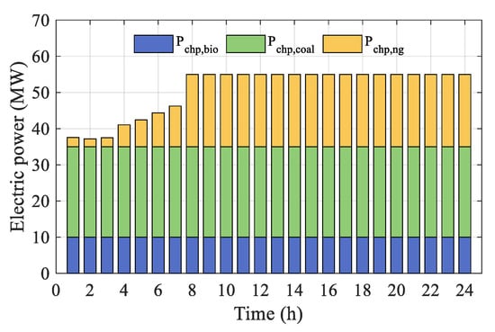 where and represent the real-time electrical and thermal power outputs of the CHP units at time t (MW), respectively. and indicate the electrical and thermal power outputs of ng-fired, coal-fired, and bio-fired CHP units, respectively (MW). are the electrical conversion efficiencies of the three types of CHP. Additionally, represents the natural gas input for ng-fired CHP units in m3/h, while and represent the coal and biomass fuel inputs for their respective CHP units in tons/h. The thermal-to-electric ratios for the three types of CHP units are given by .