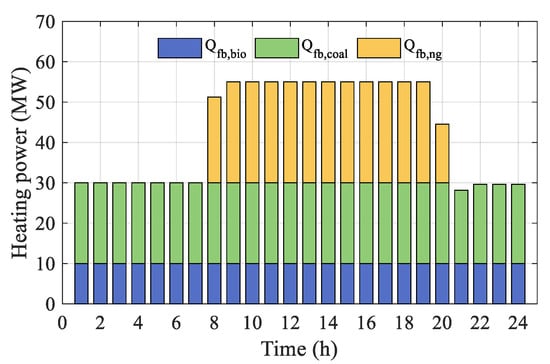 where represents the total thermal power output of the FB units at time t (MW). The variables denote the real-time thermal power outputs of coal-fired, ng-fired, and bio-fired FB units (MW), respectively. The parameters represent the energy conversion efficiencies of the three types of FB units. Additionally, indicates the calorific values of the respective fuels, measured in kWh/m3 or kWh/ton. The variables , , and represent the inputs of natural gas, coal, and biomass for the respective FB units, measured in m3/h or ton/h.