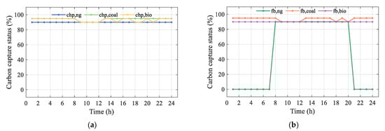 The carbon capture levels of the CCS for CHP and FB units depend on whether they undergo oxygen-enriched combustion. Binary variables and are introduced to indicate the oxygen-enriched combustion status of the units, as shown in Equation (28).