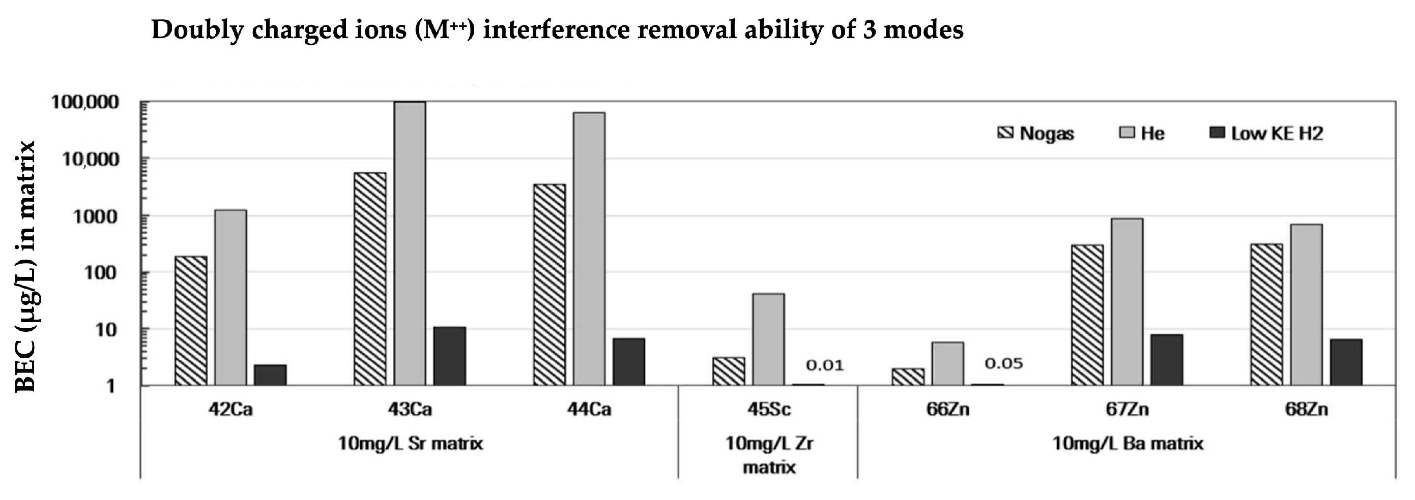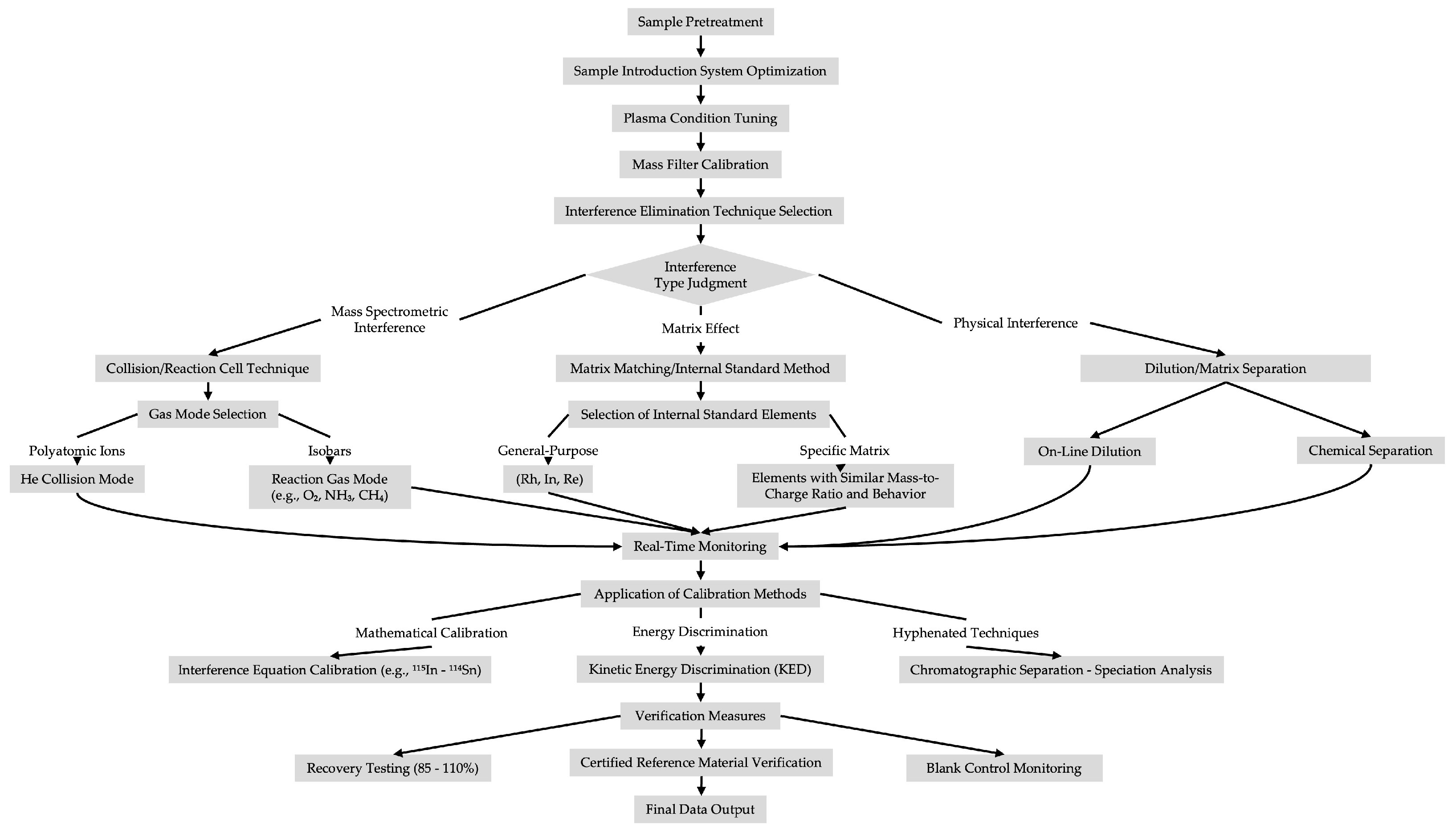 | Instrumental improvements | Cold plasma–collision cell (KED) | High-salt/organic matrices | Direct interference elimination without mathematical correction | Requires high RF power | [31] | |