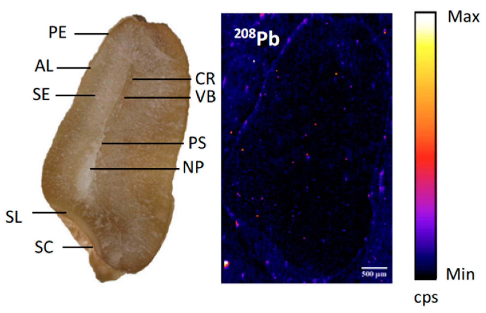 | Particulate Pb | Cereals | Wheat bran | 1.8–12.5 (Industrial = 3.5× transport zones) | 0.005 (μ-XRF: micro-X-ray fluorescence) | 85–98 | Atmospheric deposition of PbSO4 particles directly adsorbed, accounting for 56% of the bran lead source | |