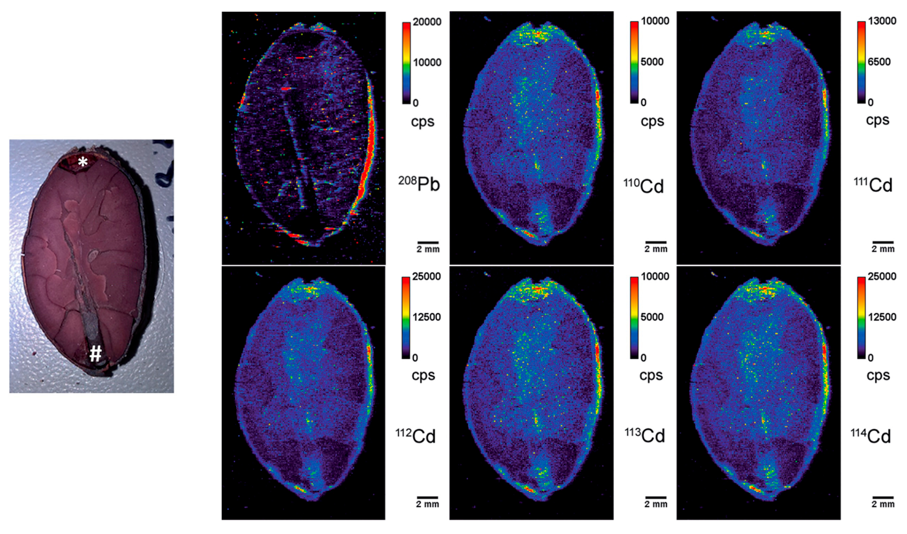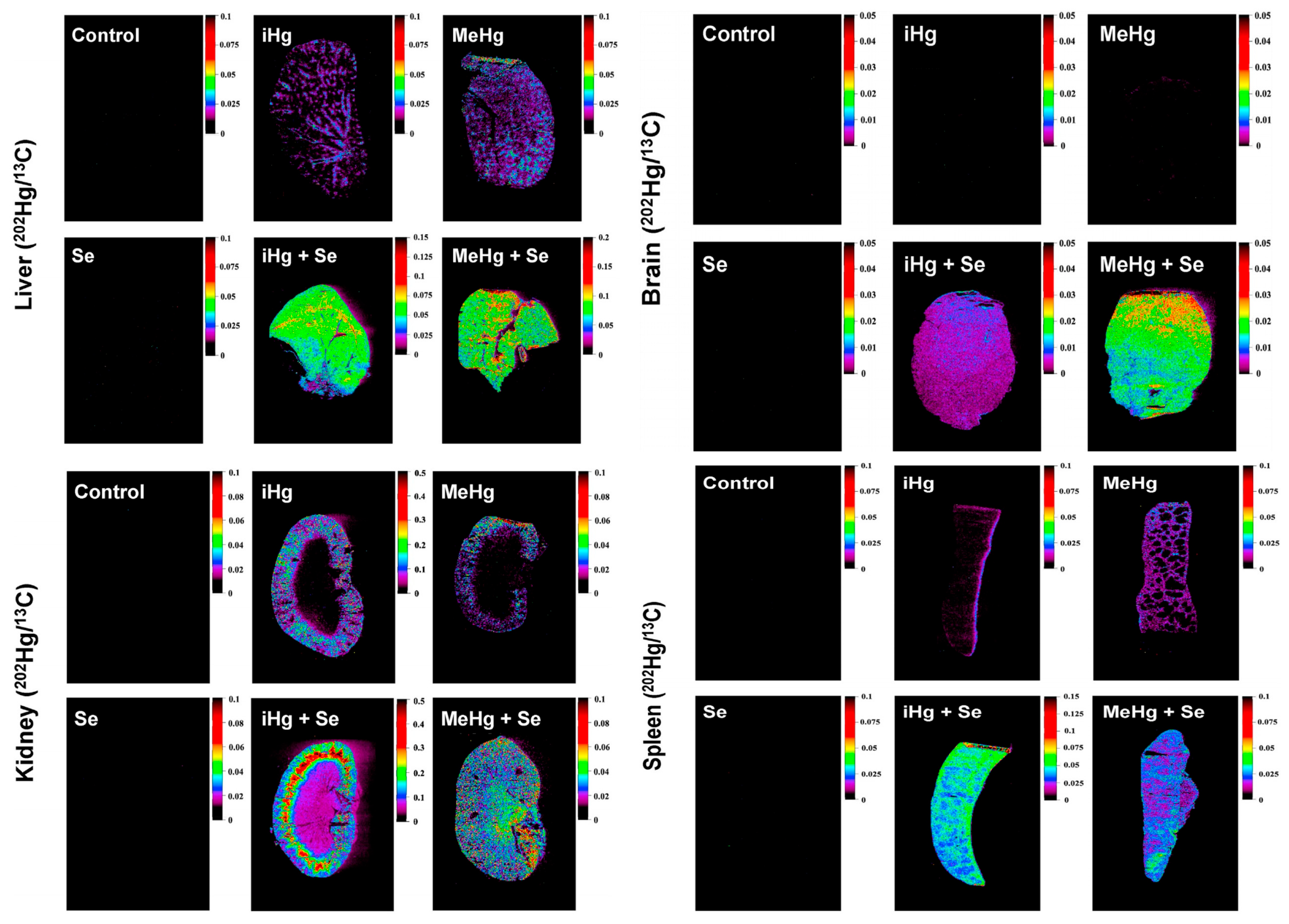 - Liu, J.; Cui, J.; Wei, X.; Li, W.; Liu, C.; Li, X.; Chen, M.; Fan, Y.; Wang, J. Investigation on selenium and mercury interactions and the distribution patterns in mice organs with LA-ICP-MS imaging. Anal. Chim. Acta 2021, 1182, 338941. [Google Scholar] [CrossRef] [PubMed]