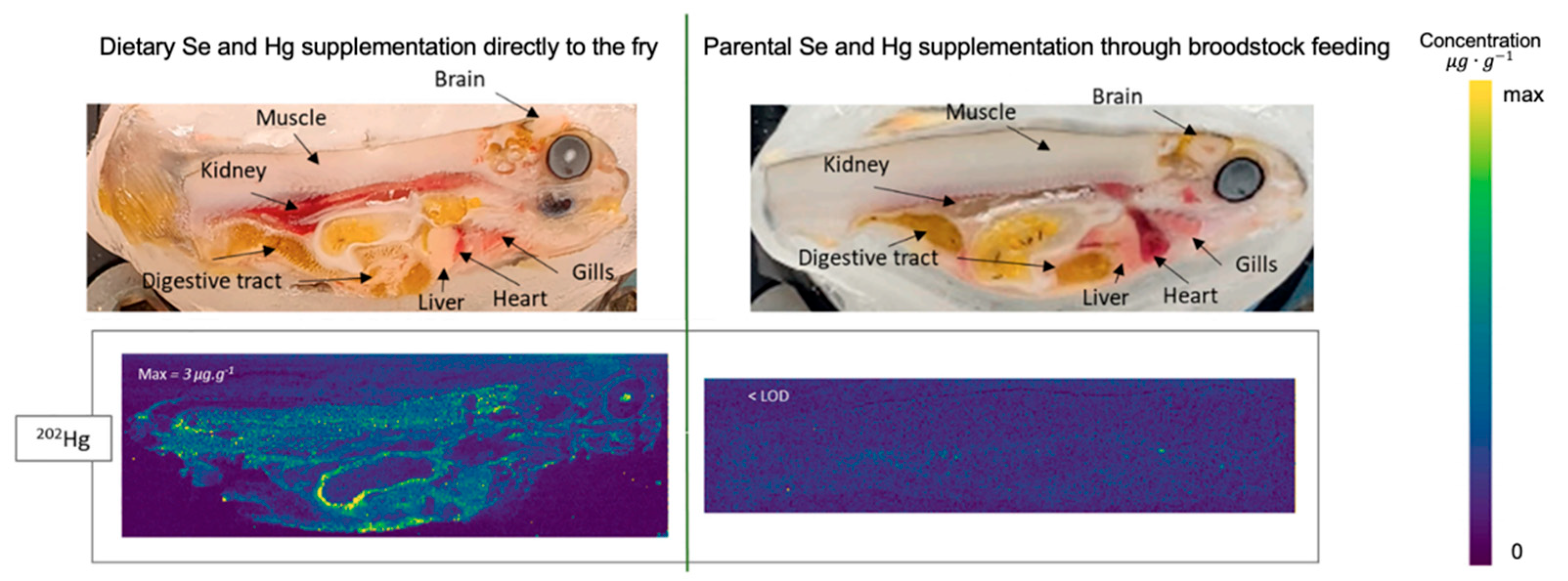 - Labeyrie, L.; Vallverdu, G.S.; Michau, D.; Fontagné-Dicharry, S.; Mounicou, S. Development of polymer films and biological matrices standards for selenium, mercury and endogenous elements quantitative LA-ICP MS imaging in entire rainbow trout fry. Microchem. J. 2023, 194, 109204. [Google Scholar] [CrossRef]