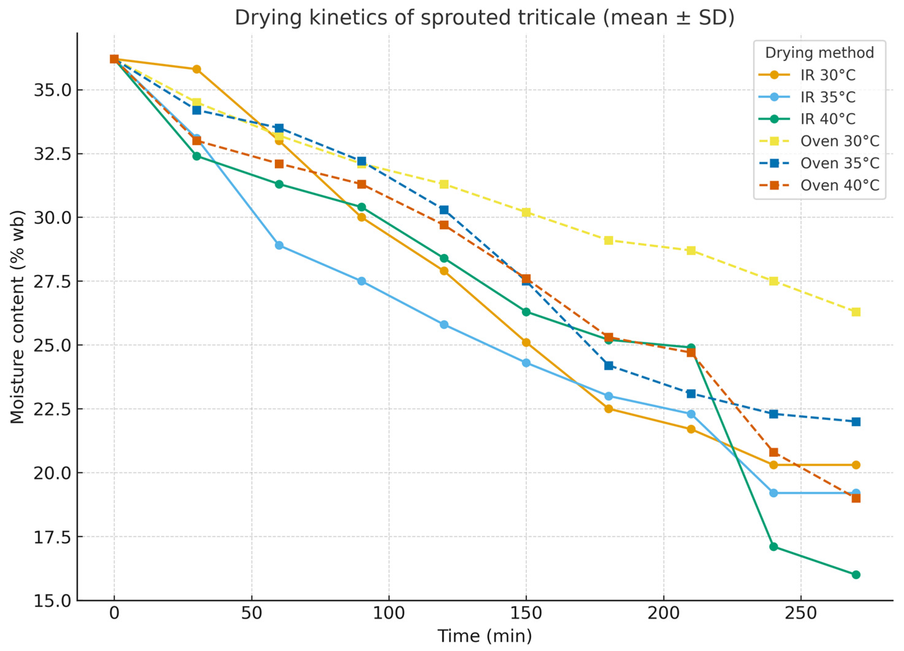 Figure 1 illustrates the drying kinetics of sprouted triticale under infrared drying and oven drying at different temperatures (30–40 °C). Moisture content decreased more rapidly under infrared drying compared to oven drying, confirming the efficiency of infrared drying treatment. Values are presented as mean ± SD; different letters indicate significant differences (