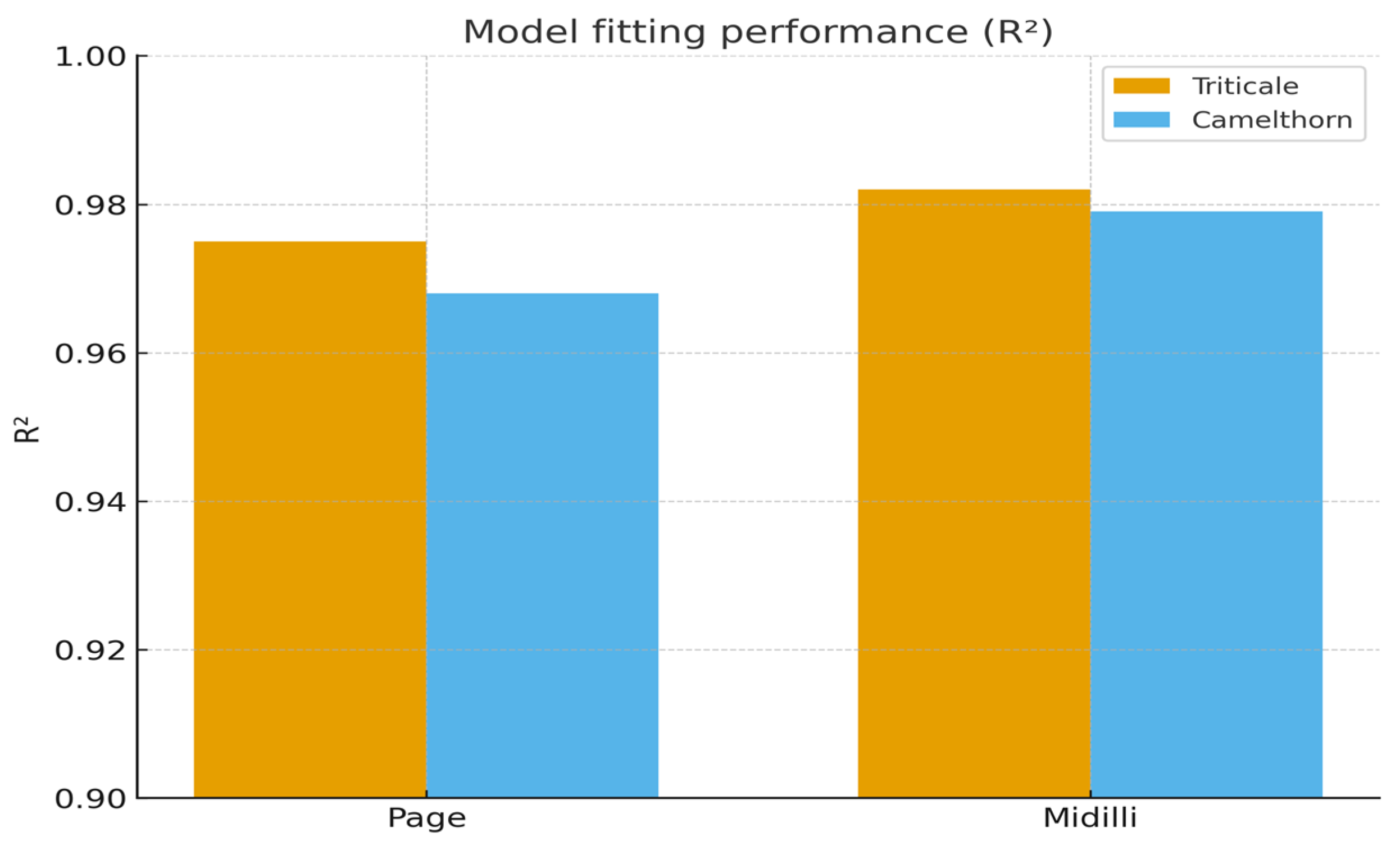 2) for the Page and Midilli models applied to triticale and camelthorn drying data. Both models achieved high R