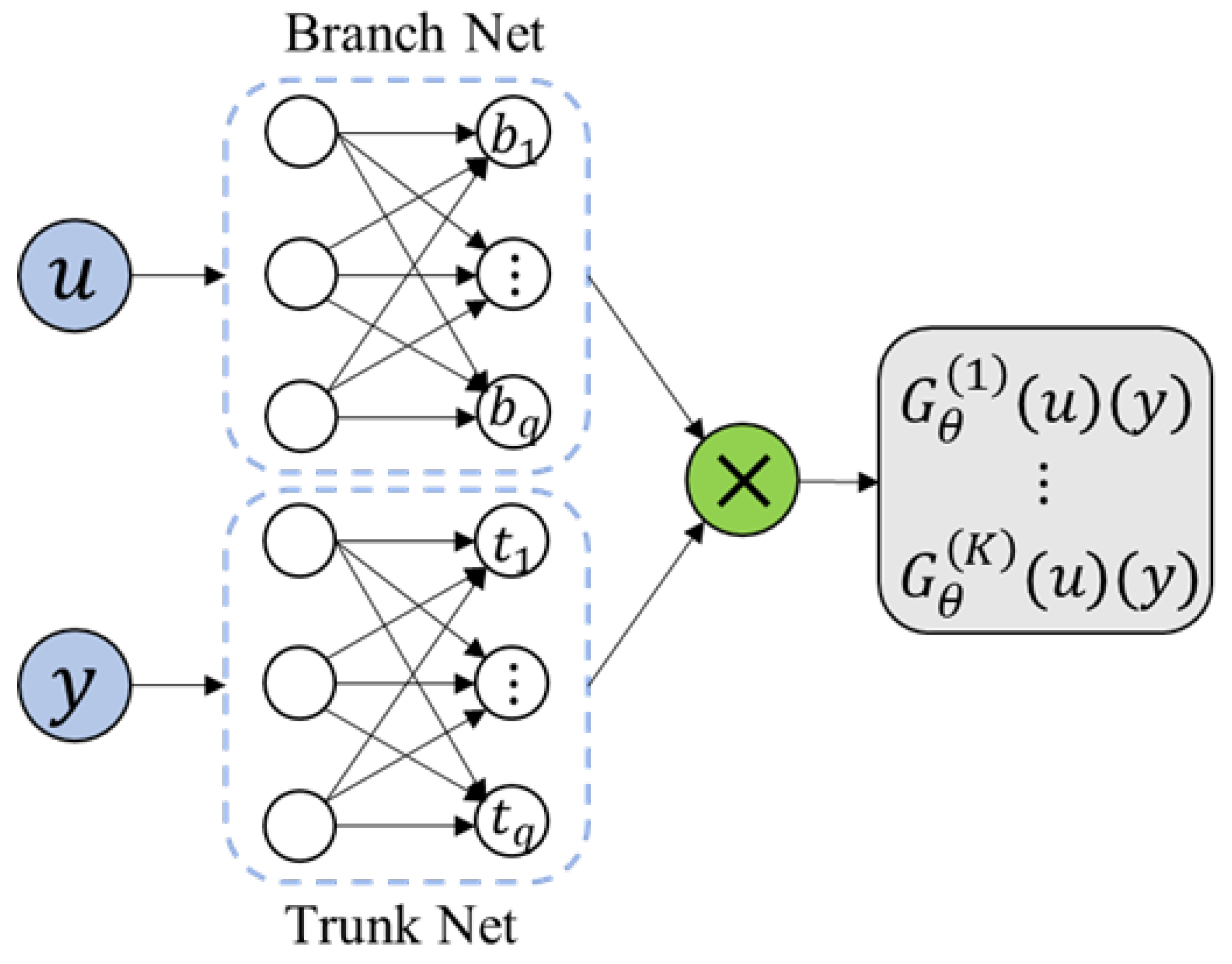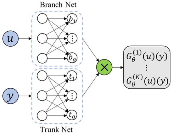 DeepONet is designed based on the universal approximation theorem of operators [], which was first proposed by Lu et al. As the first operator learning model for solving infinite-dimensional function space mapping, many researchers have demonstrated the learning ability of this model in practice [,,] and theory [,,]. DeepONet is a high-dimensional framework, as shown in Figure 2.