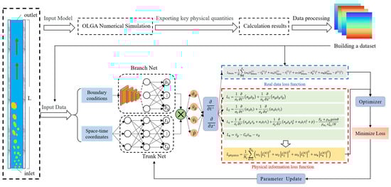 In recent years, deep learning has been gradually applied to the field of scientific computing, providing new solutions to address the above challenges []. This trend’s transformative potential is evident across diverse scientific domains, with successful applications ranging from the clinical diagnosis of gastric cancer from histopathological images to the automated, vision-based analysis of transport properties in cementitious materials [,]. Among them, the Physics-informed Neural Network (PINN) [] has shown significant advantages in solving partial differential equations. PINN embeds physical prior knowledge into neural networks and can be trained in a semi-supervised learning manner. Although PINN has achieved certain results in solving PDEs, it still cannot effectively handle parameterized partial differential equations because retraining is required when changing parameters, which increases the time cost. To this end, Lu et al. [] proposed a new solution method based on the concept of operator learning, namely the Deep Operator Network (DeepONet). Deep operator neural networks learn linear or nonlinear operators based on data and have the advantages of fast convergence speed and strong generalization ability. Currently, DeepONet has been used to solve heat conduction equations [], fluid equations [], etc. However, due to the lack of physical prior knowledge, DeepONet is essentially a pure data-driven method, and the accuracy of model training depends entirely on the amount of data. In the actual horizontal gas well two-phase flow problem, the downhole detection points and data points are relatively sparse, and the prediction accuracy of the pure data neural network model is difficult to guarantee, which needs to be improved.