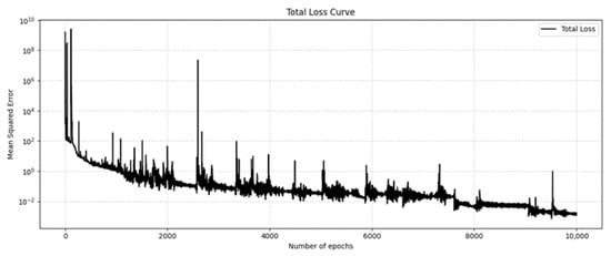 First, the Adam optimizer was used, the learning rate was set to 0.001, and the training was performed for 10,000 steps. The training loss curve is shown in Figure 5. As the number of training times increases, the total loss decreases more and more slowly. Some of the results on the test set after training are shown in Figure 6. The first line is the OLGA data value, the second line is the model prediction value, and the third line is the error distribution cloud map. Each column is the distribution cloud map of gas content, gas absolute velocity, liquid absolute velocity, and pressure. The mean relative error (MRE) is used here for display. As can be seen from the figure, the results predicted by the deep operator network model are basically consistent with the simulation results of OLGA. A closer inspection of the error cloud maps in Figure 6 reveals a more nuanced performance. While the overall agreement is excellent, the largest relative errors are predominantly concentrated near the inlet (dimensionless position ≈ −1.5) and, to a lesser extent, the outlet of the wellbore. This phenomenon is likely attributable to two factors: First, the inlet and outlet represent boundary conditions where significant physical gradients in velocity and void fraction occur, making these regions inherently more challenging for the neural network to approximate with high fidelity. Second, the flow profile near the inlet may not be fully developed, introducing complex local dynamics that are more difficult to capture compared to the more stable flow in the middle section of the pipe. Nevertheless, even in these challenging regions, the absolute error remains small, demonstrating the robustness of the model. The deep operator network model can effectively simulate the flow field distribution under different pressure outlet conditions.