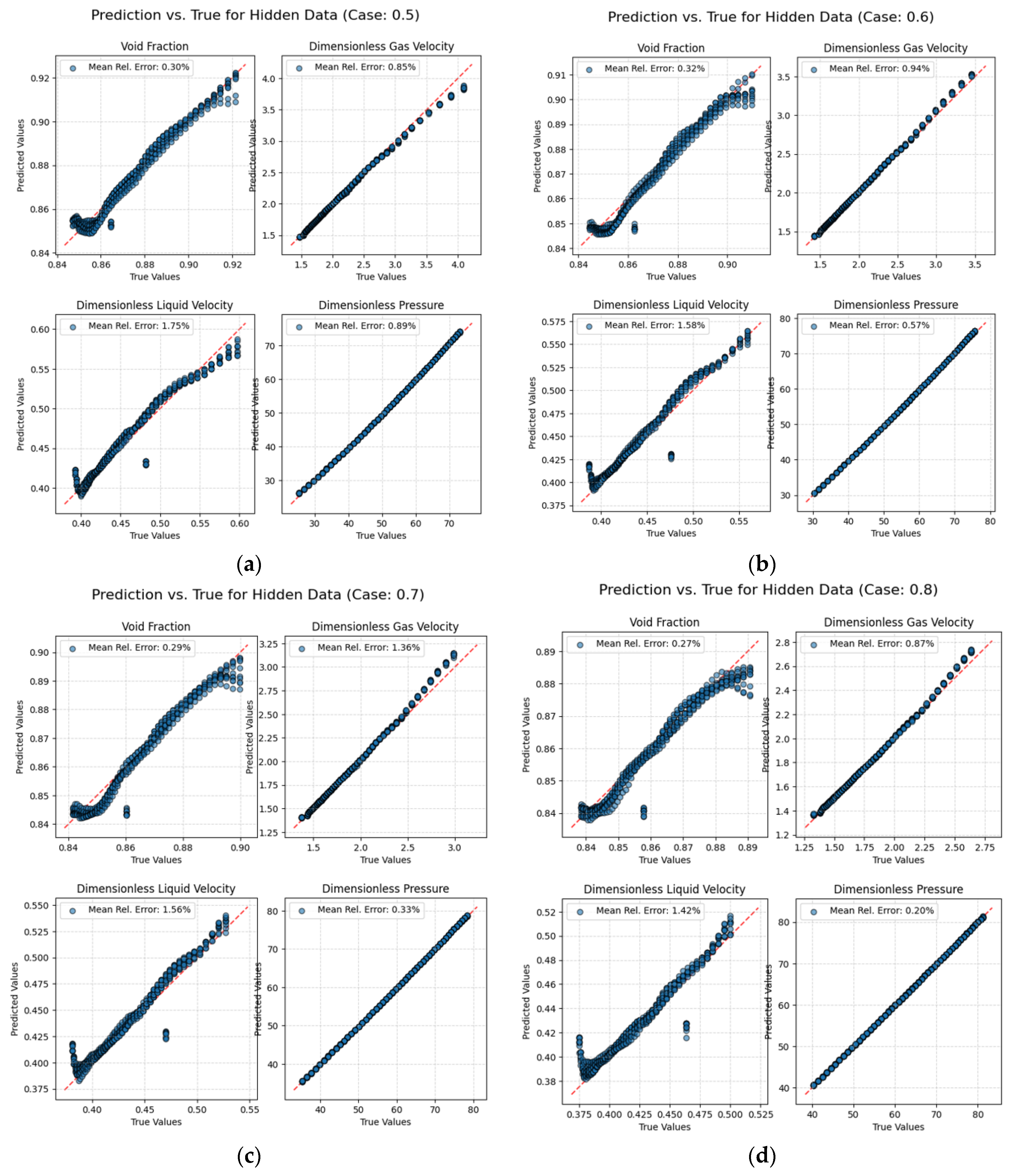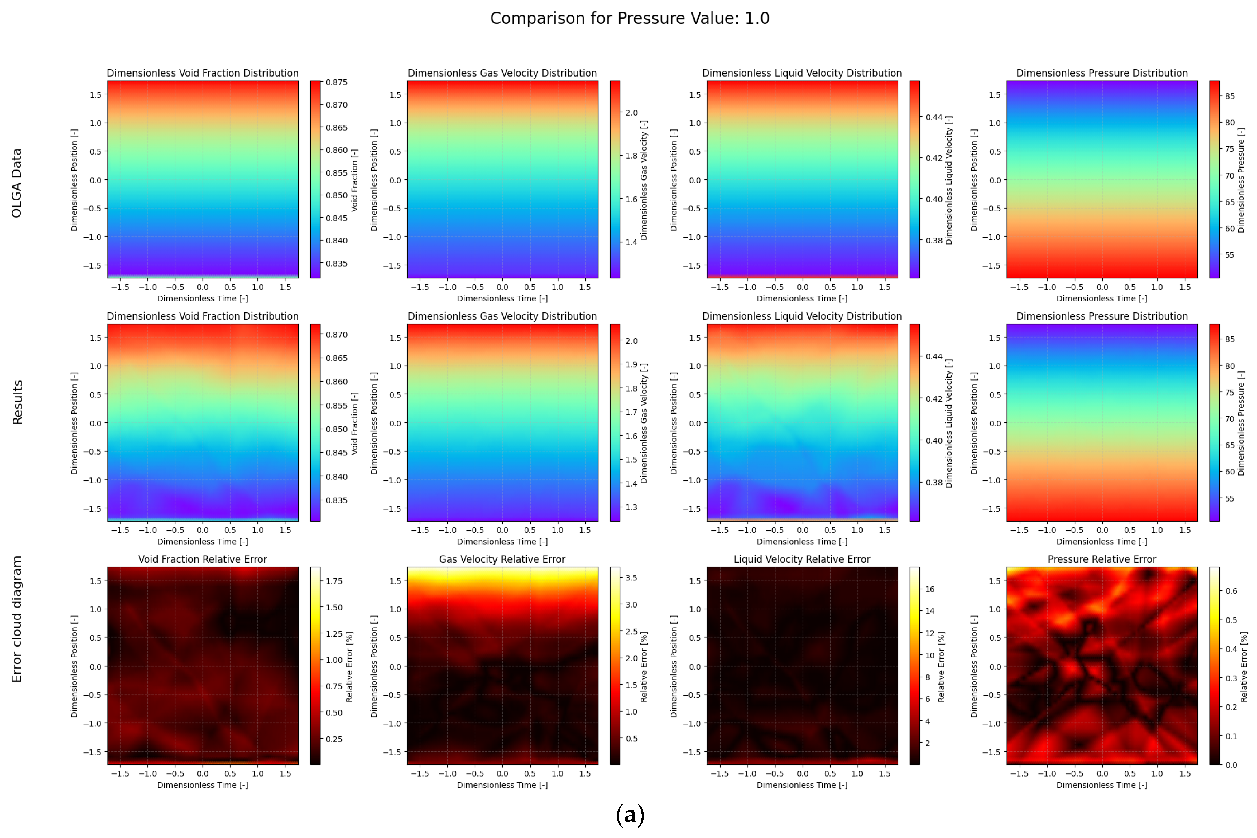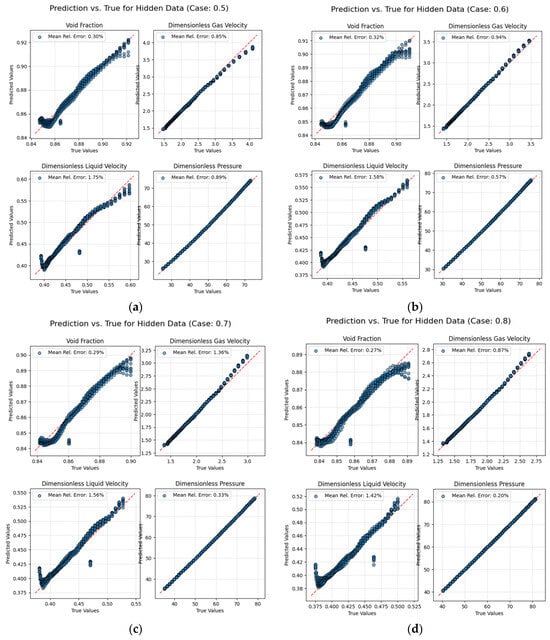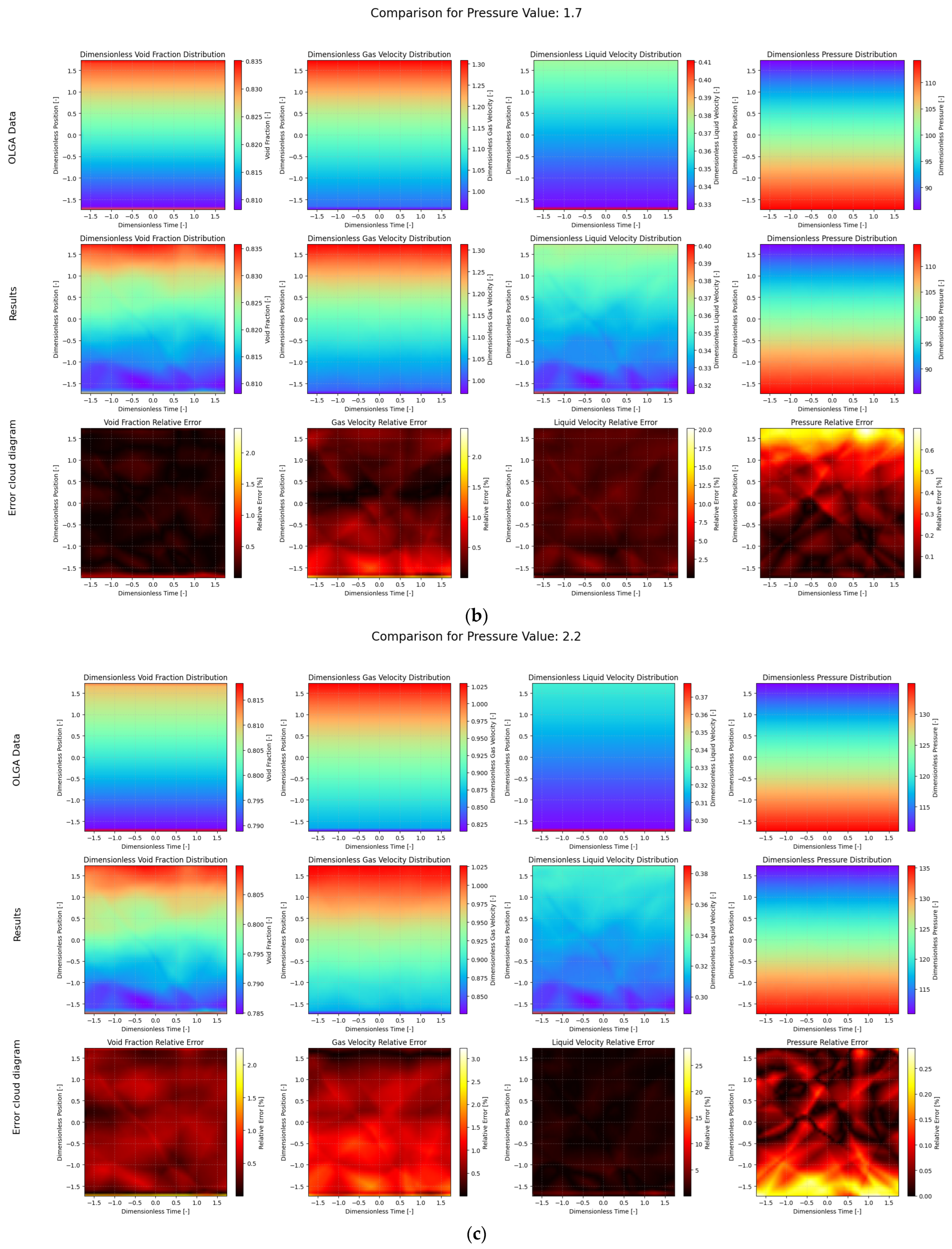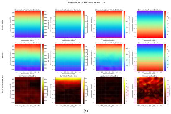 In addition, this paper also compares the time consumption of the 5 cases tested. All tests were performed using an NVIDIA RTX 4090 GPU (NVIDIA Corporation, Santa Clara, CA, USA) and AMD Ryzen 7 9700X 8-Core Processor CPU (Advanced Micro Devices, Inc., Santa Clara, CA, USA). As shown in Table 4, the test time cost of using the deep operator model is less than 0.1 s, and the calculation speed of PI-DeepONet is significantly faster than the OLGA numerical simulation. That is, after training, the model can achieve fast calculation of different working conditions. It is important to contextualize this comparison of computation times. This comparison is not intended as a direct, hardware-normalized benchmark, but rather to highlight the fundamental difference in computational paradigms. Industrial simulators like OLGA are primarily designed for high-accuracy physical modeling on CPU architectures and are not typically optimized for the massive parallelism offered by GPUs. In contrast, our deep learning approach inherently leverages GPU acceleration for rapid inference. Thus, the dramatic speed-up demonstrates the transformative potential of switching the computational paradigm for applications where real-time performance is paramount.
