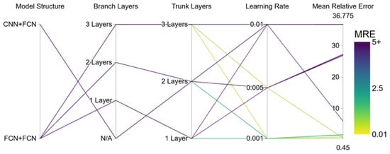 Figure 8 shows the performance of PI-DeepONet under different hyperparameters. Different network structures, different numbers of network layers, and different learning rates are used here, and the same neural network width of 64 is used. As can be seen from the figure, the network structure is the key factor affecting the performance of the model. The mean relative error (MRE) of the model using the FCN + FCN structure is significantly lower than that of the model using the CNN + FCN structure. The choice of learning rate is also crucial. When the learning rate is set to a higher 0.01, the MRE of the model is at a high level regardless of the network structure or number of layers (as shown by the dark purple line in the figure). On the contrary, lower learning rates (0.001 and 0.005) are more likely to obtain ideal performance. The best results in the figure (yellow and green lines) appear under these two learning rate settings. Under the premise of the optimal FCN + FCN structure and low learning rate, the network depth also shows a clear impact. When both the Branch network and the Trunk network are set to 3 layers, the performance of the model is generally better than that of the case with 1 or 2 layers.
