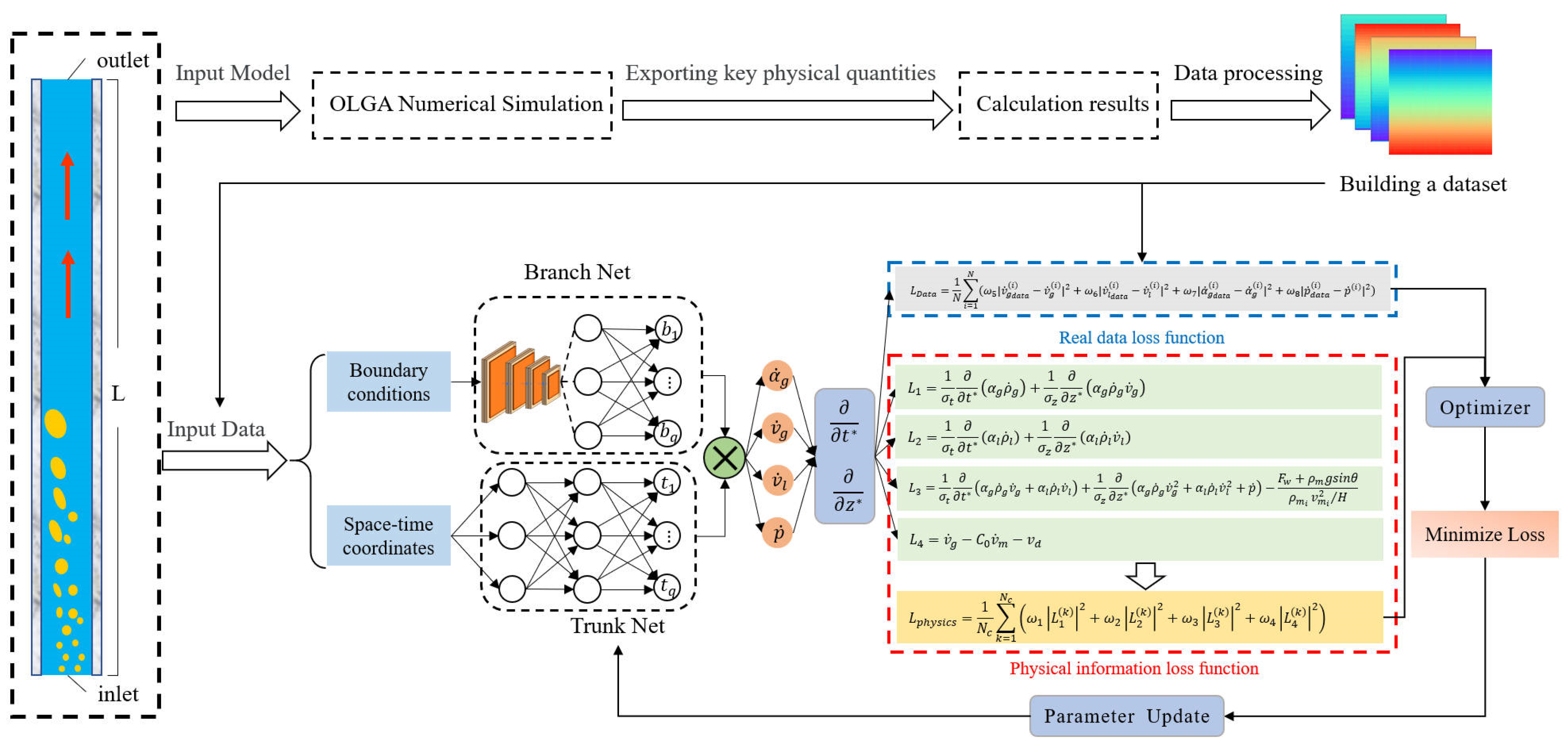 The training and testing data in this study are all generated from the numerical simulation results of OLGA. The aim is to validate the effectiveness of the proposed method as a surrogate for high-fidelity numerical simulators. This paper takes the horizontal gas well two-phase flow model in Section 1 as an example. First, the oil and gas simulation software OLGA (2022.1.0) is used for modeling and numerical calculation. The calculated data is normalized and then divided into training set/test set. The network is then trained with the training set, and the test set is used to compare the results of the finite difference method and the deep operator model.