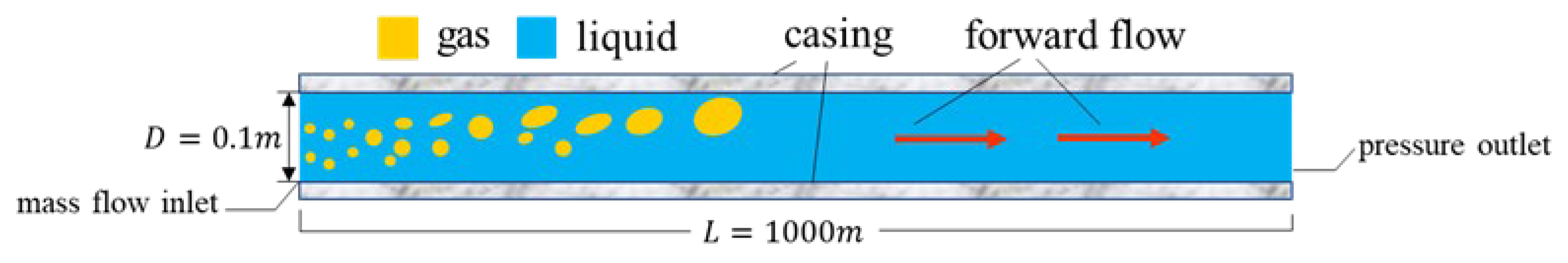 Based on the above assumptions, the control equation system of the drift flow model consists of three equations, namely the gas mass conservation equation, the liquid mass conservation equation and the gas–liquid mixed momentum conservation equation, which are usually described as: