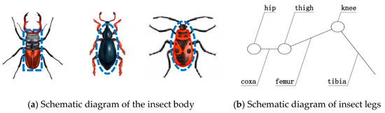 Bionics, or biologically inspired engineering, has been increasingly adopted as a fundamental paradigm for innovation in robotics [33]. As the core locomotion unit of a wheel-legged transformable bionic hexapod robot, the biomimetic hexapod structure is designed based on the morphological characteristics and motion mechanisms of insect legs. In nature, insect thoraxes are often elliptical or rectangular—a shape refined through evolution to maximize motion efficiency, as illustrated in Figure 1a. The proposed bionic structure is composed of a body frame and multiple three-degree-of-freedom (3-DOF) leg mechanisms. The body frame is designed as a simple rectangular structure, inspired by the insect thorax. This longitudinally symmetrical configuration ensures overall stability and balance, while rationally allocated leg mounting points provide sufficient rotational space for leg movement. Each 3-DOF leg provides yaw, pitch, and rotational motions, significantly enhancing the robot’s adaptability and flexibility in complex environments. The integrated design incorporates a hollow bionic leg structure, a motor-driven omni-directional wheel assembly, and an iris-based wheel–leg transformation mechanism. The operational principle of the iris–link composite mechanism is analyzed, and a kinematic model of the transformation process is established. Furthermore, joint angle rotation and positional variation under various gait states are examined through simulations of three typical gait patterns. The results demonstrate that the proposed wheel–leg transformation device substantially improves the motion stability and complex terrain adaptability of the bionic hexapod robot.