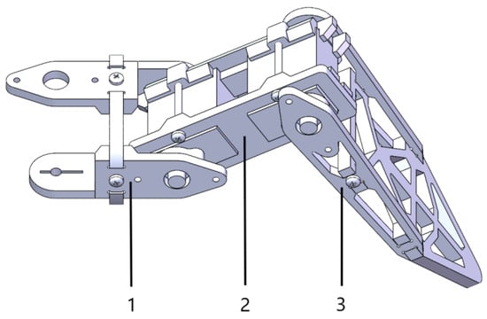 Schematic diagram of three-degree-of-freedom leg structure. 1—base joint fixture; 2—thigh joint fixture; 3—shin joint fixture.