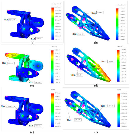 Results of leg’s static analysis. (a) The maximum yield force of tibia joint; (b) The maximum yield force of coxa joint; (c) The maximum displacement of tibia joint; (d) The maximum displacement of coxa joint; (e) The maximum strain of tibia joint; (f) The maximum strain of coxa joint.