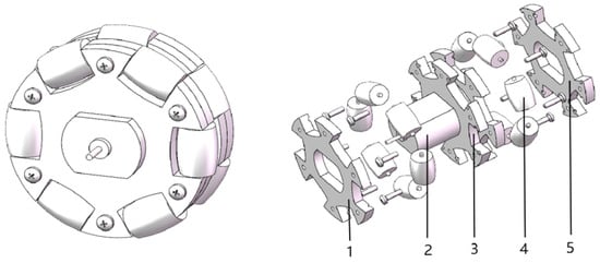 Schematic diagram of wheel structure. 1—first outer wheel hub; 2—motor; 3—inner wheel hub; 4—small roller; 5—second outer wheel hub.