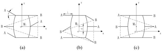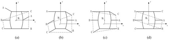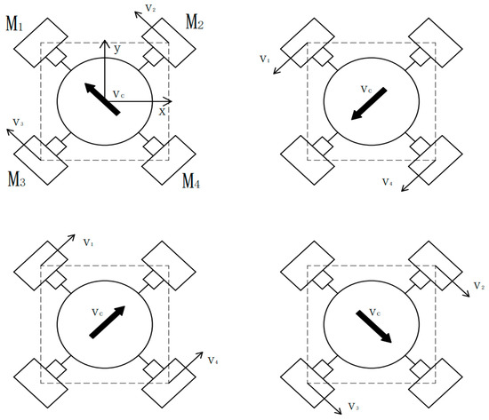 Analyzed in the four diagonal directions (left front, left rear, right front, and right rear), as shown in Figure 7, the aforementioned straight mode needs four motors to work simultaneously due to the layout characteristics of the wheels. Only two corresponding motors are required to work simultaneously in the diagonal motion mode. That is to say, it is only required to move along the direction of rotation driven by motors. The motion patterns of the four diagonal modes have been shown in Table 3. Forward rotation is indicated by +, while reverse rotation is indicated by −, and standstill is naturally indicated by 0.