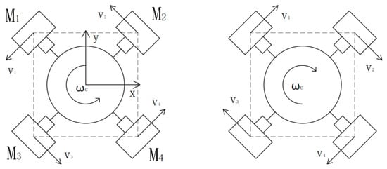 In addition to the eight straight-line methods mentioned above, the rotation of the omni-directional wheel platform can also be achieved by the motor directions being allocated reasonably under the condition that the speeds of the four motors remain the same. As shown in Figure 8, among them, M represents the torque of the four steering wheels, respectively, and it is only necessary to make the directions of the four motors the same. If they are all rotating in reverse, it naturally can be rotated counterclockwise by the omni-directional wheel platform, while it can definitely be rotated clockwise in the condition where all the motors rotate in the forward direction.
