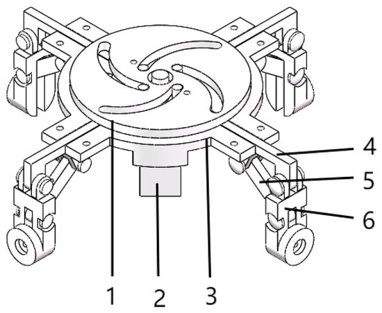 Schematic diagram of wheel-legged conversion mechanism. 1—distance-limiting plate; 2—steering engine; 3—position-limiting plate; 4—pushing rod; 5—retracting–extending rods for the wheel; 6—connecting rods of the wheel.