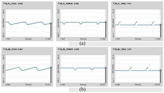 As shown in Figure 23, the rotation angle of the hip joint is observed. Since the rotation directions are opposite of the hip joints on the left and right sides, when one leg is lifted, the hip joint of that leg rotates forward, and the leg in the holding group rotates backward. Since only one leg is lifted each time, it rotates in the same direction for the joint of the lifted leg and the joint of the other leg, and there will be four joints with the same rotation direction at the same time. For the thigh and knee joints, each joint lifting the leg is in the same direction.