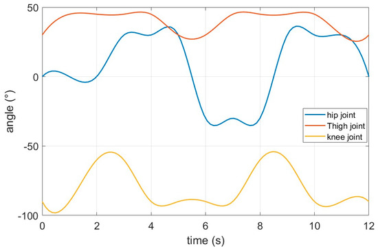 As shown in Figure 25, the hip joint undergoes reverse motion simulation walking at 6 s and 9 s, with the thigh joint rotating periodically from 30° to 45°, while the knee joint rotates synchronously from −90° to −60°, strongly verifying the effectiveness of interpolation and the periodic characteristics of motion planning.