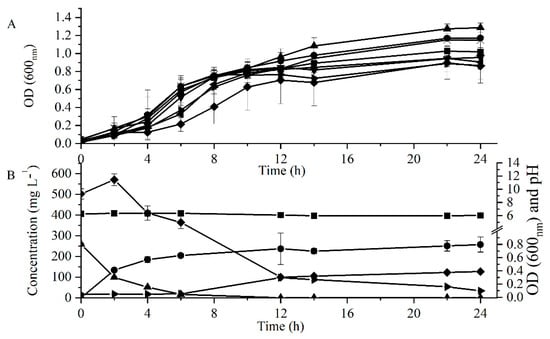 (A) Growth of B. intermedia TG 3.48 in nutrient medium containing 100 to 700 mg L−1 of FA. ■ 100 mg L−1; ● 200 mg L−1; ▲ 300 mg L−1; ▼ 400 mg L−1; ► 500 mg L−1 and ◄ 600 mg L−1; ♦ 700 mg L−1 of FA. × = biotic control; and (B) B. intermedia TG 3.48 growth in a medium with 300 mg L−1 of FA. Left y-axis (concentration mg L−1): ▲ = FA; ♦ = Glucose; ● = 4-VG. Right y-axis (pH up/OD down): ■ = pH; ► = microbial biomass. Data are mean ± SD of three replicates (n = 3).