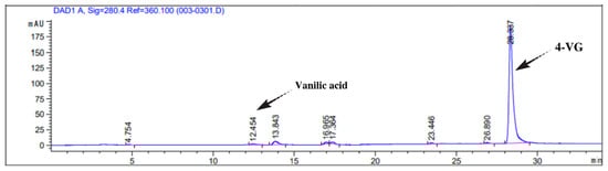 For the bioconversion of FA to 4-VG, 300 mg L−1 of FA was used to avoid inhibition in bacterial growth and to optimize the process. The concurrent decrease in FA concentration and formation of 4-VG (Figure S3) confirms the use of decarboxylation as a detoxification mechanism. Similar results have been reported for Enterobacter sp. Px6-4 [36] and K. pneumoniae [2].