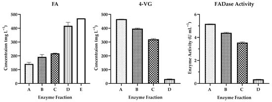 A one-way ANOVA confirmed the highly significant difference among the enzyme fractions for all tested parameters, including FADase activity, 4-VG production, and FA consumption (all p < 0.0001). Post hoc analysis with Tukey’s test showed that the whole-cell fraction (A) had significantly higher FADase activity and produced significantly more 4-VG product compared to the culture medium (D) (p < 0.0001 for both comparisons). The negligible activity and product formation in the culture medium confirm that the FADase enzyme is cell-associated and is secreted into the medium only at low concentrations.
