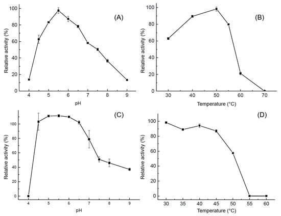Effect of pH (A) and temperature (B) on enzyme activity. Effect of pH (C) and temperature (D) on the enzyme stability in absence of substrate. The maximal activity among the data was considered as 100%. Data are mean ± SD of three replicates (n = 3).
