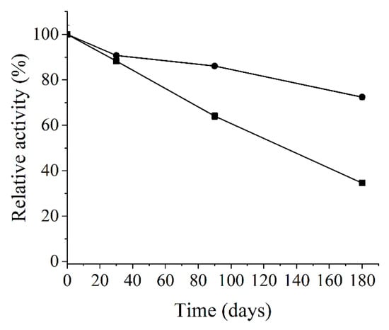 Effect of temperature on enzyme storage. ■ = 4 °C; ● = −20 °C. 100% of activity was considered based on the unincubated enzyme.