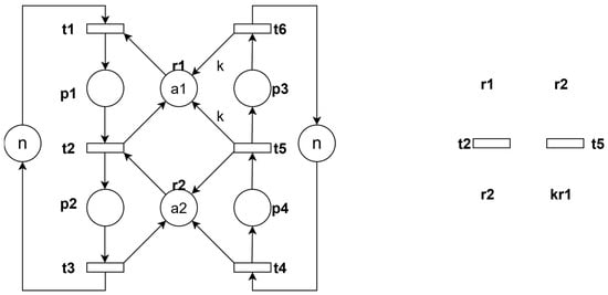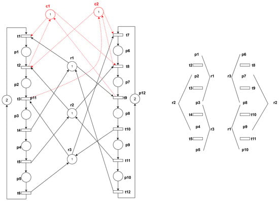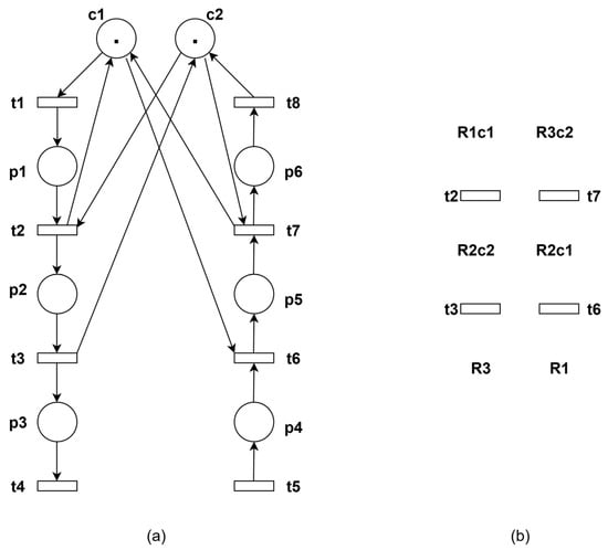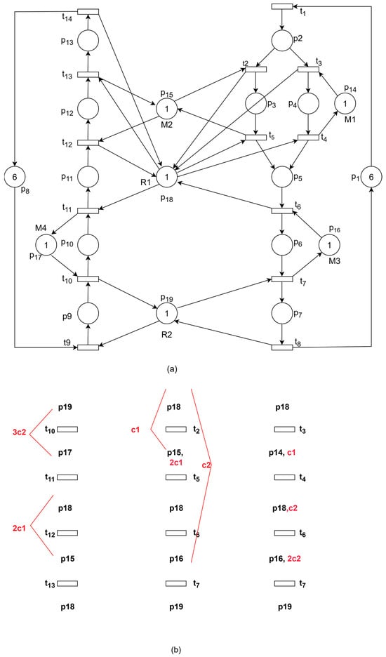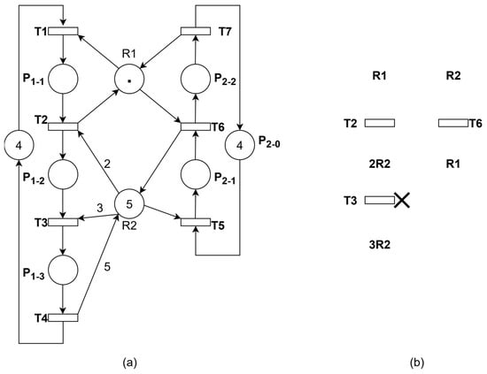 The schematic diagram of the threaded net model after adding controllers is shown in Figure 6b. When control places are treated as resources, the resulting state corresponds to the case where an operation place simultaneously occupies multiple resources. The analysis method remains similar to the previous approach.