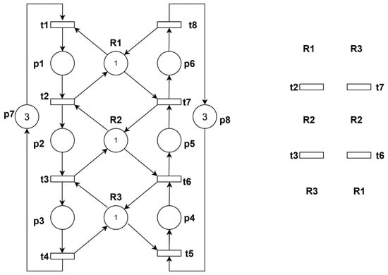 Among the many Petri nets that have been proposed, the classic one is the S3PR introduced by Ezepleta. Based on this type of network, many related models have been derived. Much of the prior work has concentrated on a particular class of acyclic Petri nets—S3PR [18,19,20,34]. The S3PR does not contain cycles; when cycles are permitted, it becomes its superclass-S*PR. The Petri net class Gadara is essentially a subclass of S*PR with these two constraints [29]. Gadara nets are very similar to S3PR, but with fewer structural constraints. For instance, they allow the presence of cycles which makes them more general than S3PR [35].