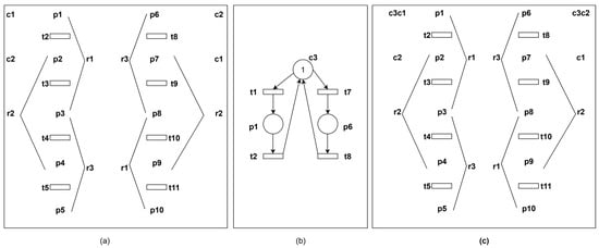 A scenario where an operation place simultaneously occupies multiple resources can be analyzed as follows: following the constraints obtained in Example 4, control places c1 and c2 are added as shown in Figure 6.