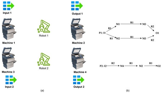 Figure 12a shows an FMS example which has 2 loading buffers (I1, I2), 2 robots (R1, R2), 4 machines (M1, M2, M3, M4), and 2 uploading buffers (O1, O2). It has 2 production sequences as shown in Figure 12b. Its PN model which has been studied in [32] is depicted in Figure 13a. It has 19 places which consist of P0 = {p1, p8}, PR = {p14,…, p19}, PA = {p2,…, p7, p9,…, p13}, and 14 transitions. The initial markings of places in PR are all one, which represents that the robot can hold one part at a time and the machine can process one part at a time.